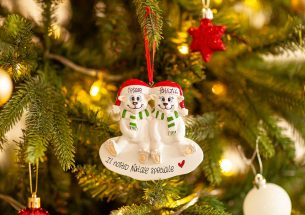Porta una piccola parte di Polo Nord e la sua magia a casa tua con i 2 orsi polari natalizi da appendere all’albero. Ogni oggetto potrà essere personalizzato, secondo i tuoi desideri, dalle nostre decoratrici. Si possono inserire i nomi dei membri della famiglia su ogni animaletto e scrivere un augurio, una data o una breve frase sul banner bianco. Tutte le scritte personalizzate sono fatte a mano, senza costi aggiuntivi. Ogni decorazione ti arriverà nella splendida Gift Box.
