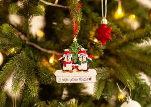 I 2 divertenti pinguini con l’albero di Natale sono tra le decorazioni più natalizie di tutto il sito. Ogni oggetto potrà essere personalizzato, secondo i tuoi desideri, dalle nostre decoratrici. Si possono inserire i nomi dei membri della famiglia su ogni animaletto e scrivere un augurio, una data o una breve frase sul banner bianco. Tutte le scritte personalizzate sono fatte a mano, senza costi aggiuntivi. Ogni decorazione ti arriverà nella splendida Gift Box.