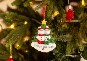 2 pupazzi di neve con l’albero sono i simboli del Natale divertente e dolce. Puoi regalare o appendere al tuo albero di Natale la decorazione, che ti arriverà nella splendida Gift Box. La vera particolarità sta nella personalizzazione, infatti, puoi inserire i nomi sui cappellini dei 2 pupazzi di neve e scrivere una breve frase, un augurio o una data sul banner bianco. Le nostre bravissime decoratrici scriveranno a mano ogni tuo desiderio, senza nessun costo aggiuntivo.