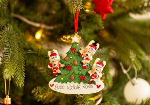 Le 3 divertenti renne sull’albero di Natale sono tra le decorazioni più natalizie del sito. Ogni oggetto potrà essere personalizzato, secondo i tuoi desideri, dalle nostre decoratrici. Si possono inserire i nomi dei membri della famiglia su ogni animaletto e scrivere un augurio, una data o una breve frase sul banner bianco. Tutte le scritte personalizzate sono fatte a mano, senza costi aggiuntivi. Ogni decorazione ti arriverà nella splendida Gift Box.