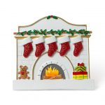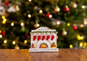 Le 5 calze appese sul camino acceso, pronte per essere riempite di regali e dolcetti, creano un’atmosfera calda e divertente per la tavola di Natale. Ogni calza è personalizzabile con un nome e nella decorazione è possibile aggiungere una data o un augurio sul banner bianco. Le nostre bravissime decoratrici seguiranno le tue indicazioni per personalizzarla a mano secondo i tuoi desideri, senza costi aggiuntivi. Ogni decorazione ti sarà consegnata nella bellissima Gift Box.