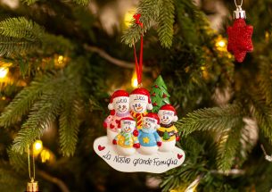5 pupazzi di neve con i maglioni di Natale festeggiano le vacanze insieme a parenti e amici. Puoi regalare o appendere al tuo albero di Natale la decorazione, che ti arriverà nella splendida Gift Box. La vera particolarità sta nella personalizzazione, infatti, puoi inserire i nomi sui cappellini dei 5 pupazzi di neve e scrivere una breve frase, un augurio o una data sul banner bianco. Le nostre bravissime decoratrici scriveranno a mano ogni tuo desiderio, senza nessun costo aggiuntivo.
