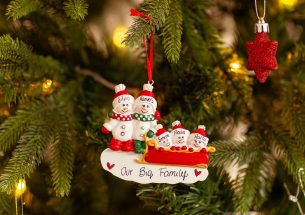 5 pupazzi di neve si divertono con lo slittino, un simbolo della famiglia in chiave divertente e natalizia. Puoi regalare o appendere al tuo albero di Natale la decorazione, che ti arriverà nella splendida Gift Box. La vera particolarità sta nella personalizzazione, infatti, puoi inserire i nomi sui cappellini dei 5 pupazzi di neve e scrivere una breve frase, un augurio o una data sul banner bianco. Le nostre bravissime decoratrici scriveranno a mano ogni tuo desiderio, senza nessun costo aggiuntivo.