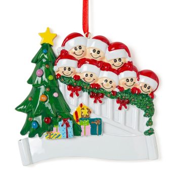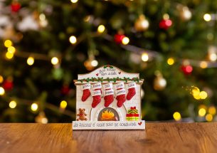 Le 8 calze appese sul camino acceso, pronte per essere riempite di regali e dolcetti, creano un’atmosfera calda e divertente per la tavola di Natale. Ogni calza è personalizzabile con un nome e nella decorazione è possibile aggiungere una data o un augurio sul banner bianco. Le nostre bravissime decoratrici seguiranno le tue indicazioni per personalizzarla a mano secondo i tuoi desideri, senza costi aggiuntivi. Ogni decorazione ti sarà consegnata nella bellissima Gift Box.