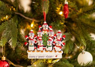 I 9 divertenti pinguini con l’albero di Natale sono tra le decorazioni più natalizie di tutto il sito. Ogni oggetto potrà essere personalizzato, secondo i tuoi desideri, dalle nostre decoratrici. Si possono inserire i nomi dei membri della famiglia su ogni animaletto e scrivere un augurio, una data o una breve frase sul banner bianco. Tutte le scritte personalizzate sono fatte a mano, senza costi aggiuntivi. Ogni decorazione ti arriverà nella splendida Gift Box.