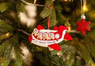 Una vacanza è quello che ci vuole, quindi saliamo in aereo e partiamo per la meta desiderata. La decorazione da appendere all’albero è pronta per essere personalizzata inserendo i nomi sui cappellini dei 4 personaggi e scrivendo una breve frase, un augurio o una data sulla parte bianca dell'aereo. Le nostre bravissime decoratrici scriveranno a mano ogni tuo desiderio, senza nessun costo aggiuntivo. Ogni decorazione sarà consegnata nella splendida Gift Box.