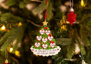 Amore fa rima con Natale. L’albero con gli 8 cuori non può mancare in casa per avere la calda e dolce atmosfera natalizia! La decorazione è pronta per essere personalizzata inserendo i nomi sugli 8 cuori e scrivendo una breve frase, un augurio o una data sul banner bianco. Le nostre bravissime decoratrici scriveranno a mano ogni tuo desiderio, senza nessun costo aggiuntivo. Ogni decorazione sarà consegnata nella splendida Gift Box.