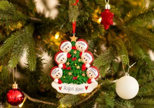 Un bellissimo ed elegante albero di Natale con stella e tanti volti che spuntano dai rami pronti ad essere chiamati per nome. La decorazione è pronta per essere personalizzata inserendo i nomi sui cappellini dei 6 personaggi e scrivendo una breve frase, un augurio o una data sul banner bianco. Le nostre bravissime decoratrici scriveranno a mano ogni tuo desiderio, senza nessun costo aggiuntivo. Ogni decorazione sarà consegnata nella splendida Gift Box.