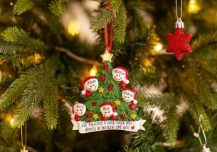 Cinque simpatiche faccette spuntano dai rami dell’albero di Natale completando il divertente addobbo natalizio. La decorazione da appendere all’albero è pronta per essere personalizzata inserendo i nomi sul cappellino di ogni personaggio e scrivendo una frase, un augurio o una data sul banner bianco. Le nostre bravissime decoratrici provvederanno a scrivere a mano ogni tuo desiderio, senza nessun costo aggiuntivo. Ogni decorazione sarà consegnata nella splendida Gift Box.