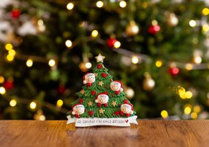 Cinque simpatiche faccette spuntano dai rami dell’albero completando la divertente decorazione per la tavola di Natale. Tutti gli addobbi natalizi per la tavola da pranzo sono pronti per essere personalizzati inserendo i nomi sul cappellino di ogni personaggio e scrivendo una frase, un augurio o una data sul banner bianco. Le nostre bravissime decoratrici scriveranno a mano ogni tuo desiderio, senza nessun costo aggiuntivo. Ogni decorazione sarà consegnata nella splendida Gift Box.