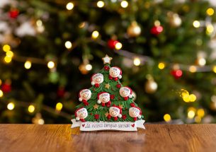 Otto simpatiche faccette spuntano dai rami dell’albero completando la divertente decorazione per la tavola di Natale. Tutti gli addobbi natalizi per la tavola da pranzo sono pronti per essere personalizzati inserendo i nomi sul cappellino di ogni personaggio e scrivendo una frase, un augurio o una data sul banner bianco. Le nostre bravissime decoratrici scriveranno a mano ogni tuo desiderio, senza nessun costo aggiuntivo. Ogni decorazione sarà consegnata nella splendida Gift Box.