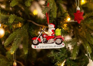 Per gli amanti delle due ruote non può mancare appesa all’albero, la decorazione Babbo Natale motociclista. La vera particolarità sta nella personalizzazione, infatti, puoi inserire il nome sul cappellino e scrivere una breve frase, un augurio o una data sul banner bianco. Le nostre bravissime decoratrici scriveranno a mano ogni tuo desiderio, senza nessun costo aggiuntivo. La decorazione arriverà nella splendida Gift Box.