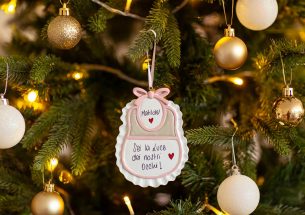 Il bavaglino, che accompagna per i primi anni i più piccoli durante i pasti, si trasforma in una splendida decorazione da rendere unica e appendere sull’albero di Natale. Il bavaglino bimba è personalizzabile, grazie ai due spazi bianchi, dove è possibile inserire un nome e una citazione, una data o una frase che le nostre decoratrici scriveranno seguendo le tue indicazioni. Tutte le personalizzazioni sono fatte a mano, senza nessun costo aggiuntivo. Ogni decorazione acquistata sarà consegnata nella Gift Box natalizia.