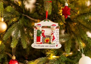 Le calze sul camino sono una tradizione divertente e dolce: a ognuno la sua, piena di caramelle e doni. La decorazione da appendere all’albero è pronta per essere personalizzata inserendo i nomi sui cappellini dei 2 personaggi e scrivendo una frase, un augurio o una data sul banner bianco. Le nostre bravissime decoratrici provvederanno a scrivere a mano ogni tuo desiderio, senza nessun costo aggiuntivo. Ogni decorazione sarà consegnata nella splendida Gift Box.