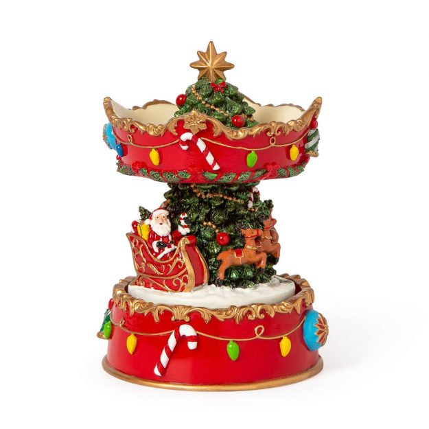 Babbo Natale è pronto ad arrivare, seduto sulla sua slitta trainata dalle renne, a casa tua per consegnare i regali a tutta la famiglia. Il carillon, con il suo movimento e le sue melodie natalizie, farà vivere proprio il momento del viaggio che ogni anno Babbo Natale fa partendo dal Circolo Polare Artico per arrivare in ogni casa.