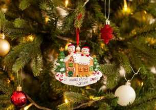 La casa pan di zenzero è pronta ad accogliere tutti con dolcetti e caramelle per rendere il Natale ancora più divertente. La decorazione da appendere all’albero è pronta per essere personalizzata inserendo i nomi sui cappellini dei 2 personaggi e scrivendo una frase, un augurio o una data sul banner bianco. Le nostre bravissime decoratrici provvederanno a scrivere a mano ogni tuo desiderio, senza nessun costo aggiuntivo. Ogni decorazione sarà consegnata nella splendida Gift Box.