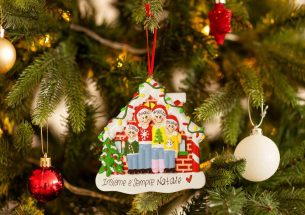 La casetta di mattoni è stata addobbata con lucine e decorazioni natalizie e accoglierà amici e parenti per le feste. La decorazione è pronta per essere personalizzata inserendo i nomi sui cappellini dei 4 personaggi e scrivendo una breve frase, un augurio o una data sul banner bianco. Le nostre bravissime decoratrici scriveranno a mano ogni tuo desiderio, senza nessun costo aggiuntivo. Ogni decorazione sarà consegnata nella splendida Gift Box.