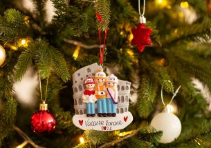 Tutti in posa… 3,2,1, click! La foto davanti al monumento più famoso di Roma è fatta! Il Colosseo è pronto a trascorrere il Natale a casa tua con la decorazione da appendere all’albero. La vera particolarità sta nella personalizzazione, infatti, puoi inserire i nomi sui cappellini dei 3 personaggi e scrivere una breve frase, un augurio o una data sul banner bianco. Le nostre bravissime decoratrici scriveranno a mano ogni tuo desiderio, senza nessun costo aggiuntivo. Ogni prodotto acquistato sarà consegnato nella splendida Gift Box.