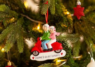 Un giro in Vespa abbracciati proprio come Gregory Peck e Audrey Hepburn in Vacanze Romane è la decorazione giusta da appendere all’albero di Natale. Le nostre decoratrici potranno personalizzarla secondo le tue indicazioni. E’ possibile inserire i nomi degli innamorati sui caschi e scrivere una frase, una data o un augurio sul banner sotto la Vespa. Tutte le personalizzazioni sono fatte a mano, senza nessun costo aggiuntivo. Ogni prodotto acquistato sarà consegnato nella splendida Gift Box.