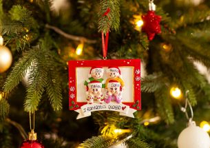 Mettetevi in posa e voilà… ecco uno scatto da incorniciare! La decorazione da appendere all’albero è pronta per essere personalizzata inserendo i nomi sui cappellini dei 4 personaggi e scrivendo una breve frase, un augurio o una data sul banner bianco. Le nostre bravissime decoratrici scriveranno a mano ogni tuo desiderio, senza nessun costo aggiuntivo. Ogni decorazione sarà consegnata nella splendida Gift Box.
