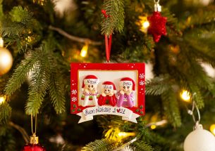 Mettetevi in posa e voilà… ecco uno scatto da incorniciare! La decorazione da appendere all’albero è pronta per essere personalizzata inserendo i nomi sui cappellini dei 3 personaggi e scrivendo una breve frase, un augurio o una data sul banner bianco. Le nostre bravissime decoratrici scriveranno a mano ogni tuo desiderio, senza nessun costo aggiuntivo. Ogni decorazione sarà consegnata nella splendida Gift Box.