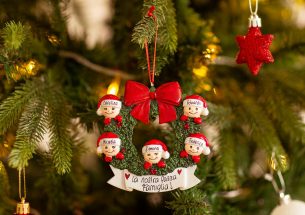 La ghirlanda è uno dei simboli natalizi, si aggancia alla porta come augurio di un sereno Natale. La decorazione da appendere all’albero è pronta per essere personalizzata inserendo i nomi sui cappellini dei 5 personaggi e scrivendo una frase, un augurio o una data sul banner bianco. Le nostre bravissime decoratrici provvederanno a scrivere a mano ogni tuo desiderio, senza nessun costo aggiuntivo. Ogni decorazione sarà consegnata nella splendida Gift Box.
