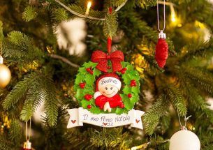 La ghirlanda con il fiocco rosso è un portafortuna da appendere alla porta di casa per Natale. In questo caso la decorazione è da appendere all’albero di Natale ed è pronta per essere personalizzata inserendo il nome sul cappellino del personaggio e scrivendo una breve frase, un augurio o una data sul banner bianco. Le nostre bravissime decoratrici scriveranno a mano ogni tuo desiderio, senza nessun costo aggiuntivo. Ogni decorazione sarà consegnata nella splendida Gift Box.