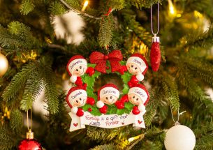 La ghirlanda con il fiocco rosso è un portafortuna da appendere alla porta di casa per Natale. In questo caso la decorazione è da appendere all’albero di Natale ed è pronta per essere personalizzata inserendo i nomi sui cappellini dei 5 personaggi e scrivendo una breve frase, un augurio o una data sul banner bianco. Le nostre bravissime decoratrici scriveranno a mano ogni tuo desiderio, senza nessun costo aggiuntivo. Ogni decorazione sarà consegnata nella splendida Gift Box.