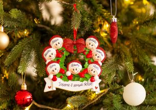 La ghirlanda con il fiocco rosso è un portafortuna da appendere alla porta di casa per Natale. In questo caso la decorazione è da appendere all’albero di Natale ed è pronta per essere personalizzata inserendo i nomi sui cappellini dei 7 personaggi e scrivendo una breve frase, un augurio o una data sul banner bianco. Le nostre bravissime decoratrici scriveranno a mano ogni tuo desiderio, senza nessun costo aggiuntivo. Ogni decorazione sarà consegnata nella splendida Gift Box.
