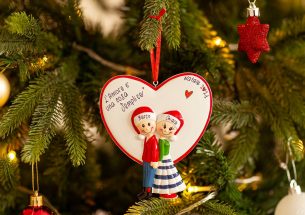 Unita all’interno di un cuore, felice e con un bel sorriso contagioso è la coppia protagonista dell’originale decorazione da appendere all’albero di Natale. Le nostre decoratrici potranno personalizzarla secondo le tue indicazioni. E’ possibile inserire i nomi della coppia sui cappelli e scrivere una frase, una data o un augurio nel cuore. Tutte le personalizzazioni sono fatte a mano, senza costi aggiuntivi. Ogni prodotto sarà consegnato nella Gift Box.