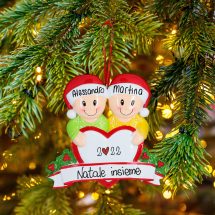 Una dolce coppia abbraccia un grande cuore bianco con il bordo rosso per augurare a tutti buon Natale! La decorazione, pronta per essere appesa all’albero di Natale, arriverà nella splendida Gift Box. La vera particolarità sta nella personalizzazione, infatti, puoi inserire i nomi sui cappellini dei 2 personaggi e scrivere una breve frase, un augurio o una data sul cuore e nel banner bianco. Le nostre bravissime decoratrici scriveranno a mano ogni tuo desiderio, senza nessun costo aggiuntivo.