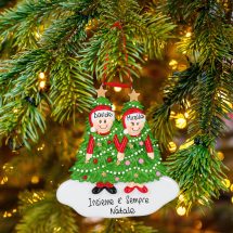 Due faccette che spuntano, insieme ai piedi e alle braccia, dai rami degli alberi di Natale, completano l'addobbo natalizio in maniera divertente e unica. La decorazione da appendere all’albero è pronta per essere personalizzata inserendo i nomi sui cappellini dei personaggi e scrivendo una frase, un augurio o una data sul banner bianco. Le nostre bravissime decoratrici provvederanno a scrivere a mano ogni tuo desiderio, senza nessun costo aggiuntivo. Ogni decorazione sarà consegnata nella splendida Gift Box.