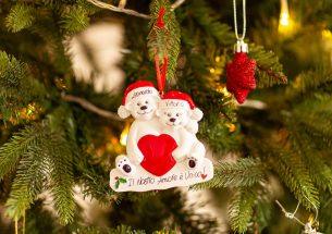 La coppia di orsi polari che stringe un cuore, simbolo dell’amore, è una delle decorazioni più romantiche di Natale. Ogni oggetto potrà essere personalizzato, secondo i tuoi desideri, dalle nostre decoratrici. Si possono inserire i nomi dei membri della famiglia su ogni animaletto e scrivere un augurio, una data o una breve frase sul banner bianco. Tutte le scritte personalizzate sono fatte a mano, senza costi aggiuntivi. Ogni decorazione ti arriverà nella splendida Gift Box.