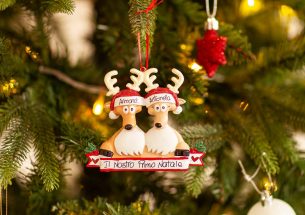 La coppia di renne divertenti e colorate è la decorazione giusta da appendere all’albero di Natale. Ogni oggetto potrà essere personalizzato, secondo i tuoi desideri, dalle nostre decoratrici. Si possono inserire i nomi dei membri della famiglia su ogni animaletto e scrivere una data, un augurio, una data o una breve frase sul banner bianco. Tutte le scritte personalizzate sono fatte a mano, senza costi aggiuntivi. Ogni decorazione ti arriverà nella splendida Gift Box.