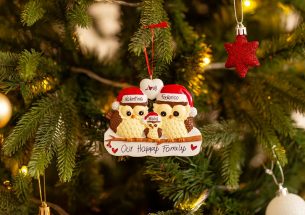 La famiglia di 3 gufi portafortuna è la decorazione più originale e simpatica da appendere all’Albero di Natale. Ogni oggetto potrà essere personalizzato, secondo i tuoi desideri, dalle nostre decoratrici. Si possono inserire i nomi dei membri della famiglia su ogni animaletto e scrivere un augurio, una data o una breve frase sul banner bianco. Tutte le scritte personalizzate sono fatte a mano, senza costi aggiuntivi. Ogni decorazione ti arriverà nella splendida Gift Box.