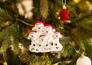 La famiglia di 5 orsi polari stretti in un grande abbraccio è una decorazione dolce e rassicurante da appendere all’albero. Ogni oggetto potrà essere personalizzato, secondo i tuoi desideri, dalle nostre decoratrici. Si possono inserire i nomi dei membri della famiglia su ogni animaletto e scrivere un augurio, una data o una breve frase sul banner bianco. Tutte le scritte personalizzate sono fatte a mano, senza costi aggiuntivi. Ogni decorazione ti arriverà nella splendida Gift Box.