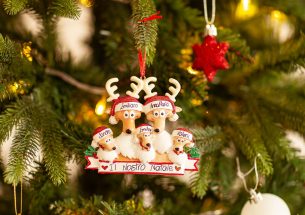 La famiglia di 5 renne divertenti e colorate è la decorazione giusta da appendere all’albero di Natale. Ogni oggetto potrà essere personalizzato, secondo i tuoi desideri, dalle nostre decoratrici. Si possono inserire i nomi dei membri della famiglia su ogni animaletto e scrivere un augurio, una data o una breve frase sul banner bianco. Tutte le scritte personalizzate sono fatte a mano, senza costi aggiuntivi. Ogni decorazione ti arriverà nella splendida Gift Box.
