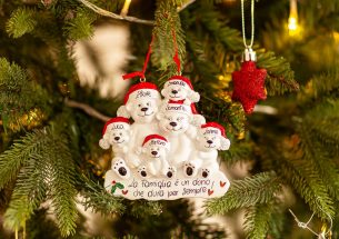 La famiglia di 6 orsi polari stretti in un grande abbraccio è una decorazione dolce e rassicurante da appendere all’albero. Ogni oggetto potrà essere personalizzato, secondo i tuoi desideri, dalle nostre decoratrici. Si possono inserire i nomi dei membri della famiglia su ogni animaletto e scrivere un augurio, una data o una breve frase sul banner bianco. Tutte le scritte personalizzate sono fatte a mano, senza costi aggiuntivi. Ogni decorazione ti arriverà nella splendida Gift Box.