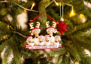 La famiglia di 6 renne divertenti e colorate è la decorazione giusta da appendere all’albero di Natale. Ogni oggetto potrà essere personalizzato, secondo i tuoi desideri, dalle nostre decoratrici. Si possono inserire i nomi dei membri della famiglia su ogni animaletto e scrivere un augurio, una data o una breve frase sul banner bianco. Tutte le scritte personalizzate sono fatte a mano, senza costi aggiuntivi. Ogni decorazione ti arriverà nella splendida Gift Box.
