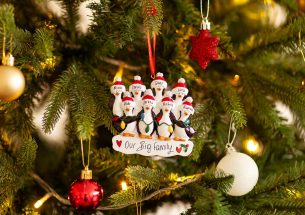 La grande famiglia di 8 pinguini che ti aiuterà a mettere le lucine di Natale è una decorazione originale e simpatica da appendere all’albero. Ogni oggetto potrà essere personalizzato, secondo i tuoi desideri, dalle nostre decoratrici. Si possono inserire i nomi dei membri della famiglia su ogni animaletto e scrivere un augurio, una data o una breve frase sul banner bianco. Tutte le scritte personalizzate sono fatte a mano, senza costi aggiuntivi. Ogni decorazione ti arriverà nella splendida Gift Box.