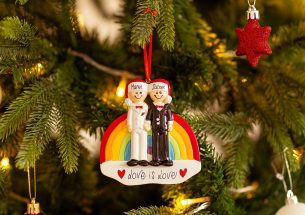 Love is love! L’amore è bellissimo sempre! Una decorazione originale per l’albero ma anche una bomboniera unica da regalare agli invitati al matrimonio. Le nostre decoratrici potranno personalizzarla secondo le tue indicazioni. E’ possibile inserire i nomi degli innamorati sui cappelli e scrivere una frase, una data o un augurio sul banner bianco. Tutte le personalizzazioni sono fatte a mano, senza costi aggiuntivi. Ogni prodotto sarà consegnato nella Gift Box.
