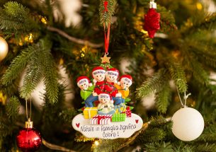 Un’atmosfera natalizia piena di allegria con lucine colorate e pacchi regalo sotto l’albero. La decorazione è pronta per essere personalizzata inserendo i nomi sui cappellini dei 5 personaggi e scrivendo una breve frase, un augurio o una data sul banner bianco. Le nostre bravissime decoratrici scriveranno a mano ogni tuo desiderio, senza nessun costo aggiuntivo. Ogni decorazione sarà consegnata nella splendida Gift Box.