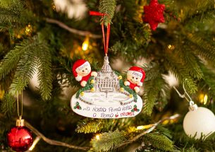 Quest’anno il Natale lo trascorriamo con uno dei monumenti più famosi del mondo: San Pietro. Una parte di storia in una decorazione da appendere all’albero per omaggiare la città eterna e la sua festività più importante. La vera particolarità sta nella personalizzazione, infatti, puoi inserire i nomi sui cappellini dei 2 personaggi e scrivere una breve frase, un augurio o una data sul banner bianco. Le nostre bravissime decoratrici scriveranno a mano ogni tuo desiderio, senza nessun costo aggiuntivo. Ogni prodotto acquistato sarà consegnato nella splendida Gift Box.
