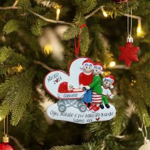 L'atmosfera natalizia si scalda con l'arrivo di un nuovo membro della famiglia pronto per essere portato a passeggio tra le lucine e la neve. La decorazione è pronta per essere personalizzata inserendo i nomi sui cappellini dei personaggi e scrivendo una breve frase, un augurio o una data sul banner bianco. Le nostre bravissime decoratrici scriveranno a mano ogni tuo desiderio, senza nessun costo aggiuntivo. Ogni decorazione sarà consegnata nella splendida Gift Box.