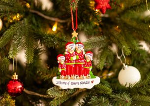 Dopo una giornata di impegni si torna a casa, mettiamo il pigiama di Natale e ci sediamo sul divano tutti insieme a guardare la tv. La decorazione è pronta per essere personalizzata inserendo i nomi sui cappellini dei 4 personaggi e scrivendo una breve frase, un augurio o una data sul banner bianco. Le nostre bravissime decoratrici scriveranno a mano ogni tuo desiderio, senza nessun costo aggiuntivo. Ogni decorazione sarà consegnata nella splendida Gift Box.