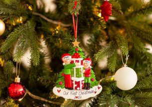 I due elementi più simbolici del Natale? I regali e gli abbracci, i primi sono una bella sorpresa mentre i secondi creano un’atmosfera d’amore e affetto. La decorazione da appendere all’albero è pronta per essere personalizzata inserendo i nomi sui cappellini dei 2 personaggi e scrivendo una frase, un augurio o una data sul banner bianco. Le nostre bravissime decoratrici provvederanno a scrivere a mano ogni tuo desiderio, senza nessun costo aggiuntivo. Ogni decorazione sarà consegnata nella splendida Gift Box.