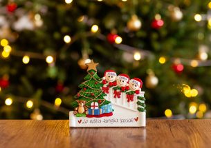 Una scalinata che arriva in salotto dove si può ammirare l’albero con luci e addobbi e controllare se sono arrivati i pacchi portati da Babbo Natale. La decorazione per la tavola di Natale è pronta per essere personalizzata inserendo i nomi sui cappellini dei 3 personaggi e scrivendo una breve frase, un augurio o una data sul banner bianco. Le nostre bravissime decoratrici scriveranno a mano ogni tuo desiderio, senza nessun costo aggiuntivo. Ogni decorazione sarà consegnata nella splendida Gift Box.