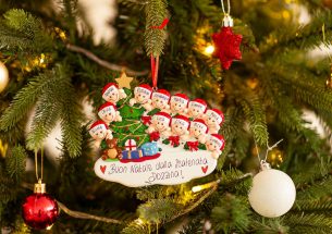 Una scalinata che arriva in salotto dove si può ammirare l’albero di Natale con luci e addobbi e controllare se sono arrivati i pacchi portati da Babbo Natale. La decorazione è pronta per essere personalizzata inserendo i nomi sui cappellini dei 12 personaggi e scrivendo una breve frase, un augurio o una data sul banner bianco. Le nostre bravissime decoratrici scriveranno a mano ogni tuo desiderio, senza nessun costo aggiuntivo. Ogni decorazione sarà consegnata nella splendida Gift Box.