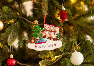 Una scalinata che arriva in salotto dove si può ammirare l’albero di Natale con luci e addobbi e controllare se sono arrivati i pacchi portati da Babbo Natale. La decorazione è pronta per essere personalizzata inserendo i nomi sui cappellini dei 5 personaggi e scrivendo una breve frase, un augurio o una data sul banner bianco. Le nostre bravissime decoratrici scriveranno a mano ogni tuo desiderio, senza nessun costo aggiuntivo. Ogni decorazione sarà consegnata nella splendida Gift Box.