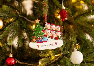 Una scalinata che arriva in salotto dove si può ammirare l’albero di Natale con luci e addobbi e controllare se sono arrivati i pacchi portati da Babbo Natale. La decorazione è pronta per essere personalizzata inserendo i nomi sui cappellini dei 6 personaggi e scrivendo una breve frase, un augurio o una data sul banner bianco. Le nostre bravissime decoratrici scriveranno a mano ogni tuo desiderio, senza nessun costo aggiuntivo. Ogni decorazione sarà consegnata nella splendida Gift Box.